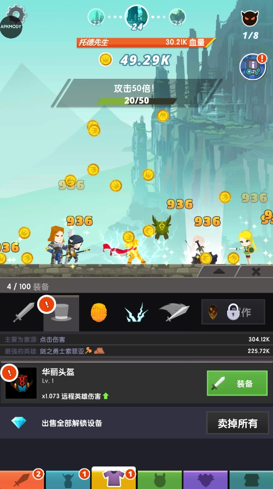 1、游戏省去各类繁复的操作,只需快速点击屏幕,剑圣便会频频出招,解决入侵的怪物!英雄的攻击取决于你点击的速度,面对关卡BOSS,记得全力出击!