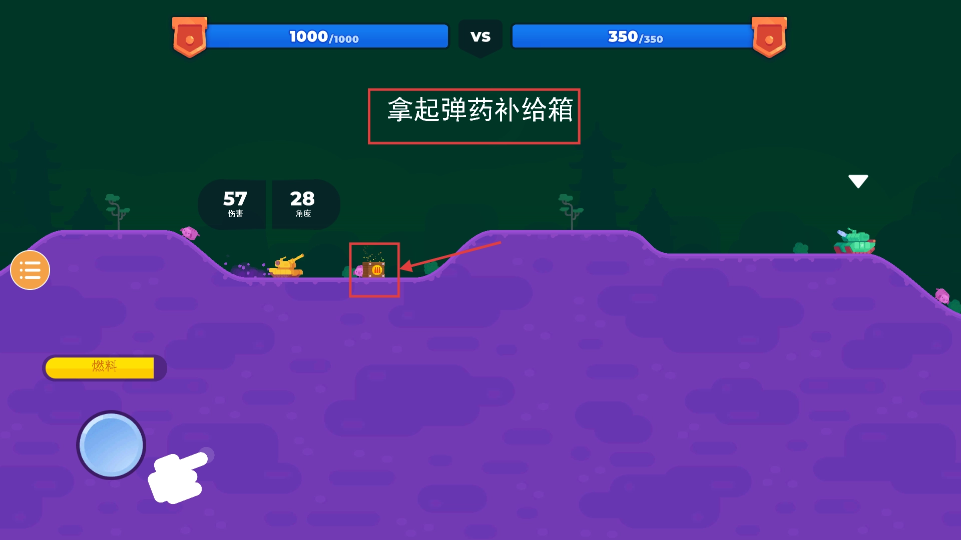 1、战斗时用左下角摇杆移动坦克,靠近【弹药补给箱】拾取,补充弹药以便持续攻击对手。