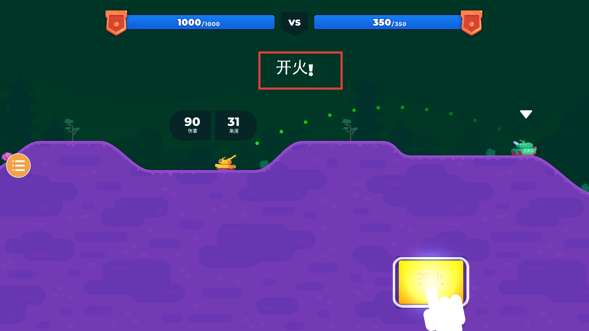 3、在确认弹道轨迹合适后,点击【开火】按钮即可发起攻击,此时会消耗弹药来打击对手的坦克。