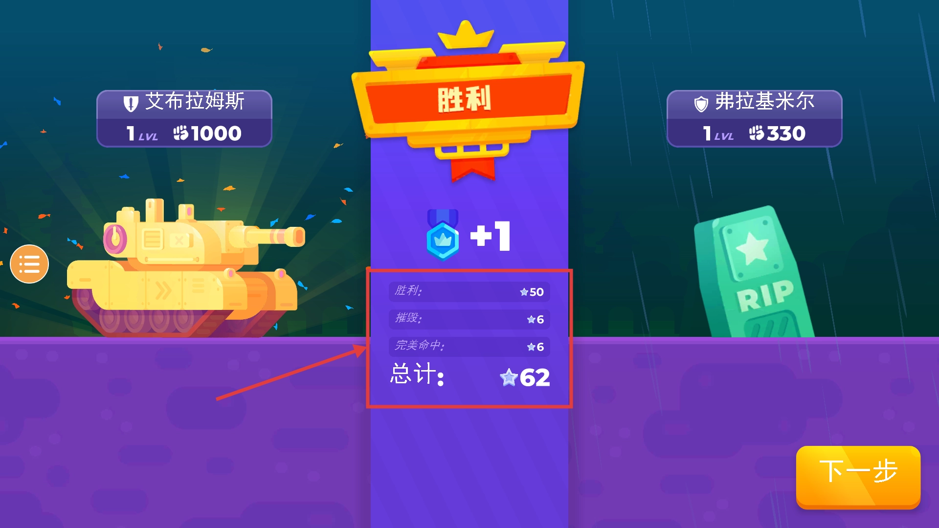 4、击败对手获得胜利,查看【总计62】星星奖励,点击下一步进入下一场战斗。