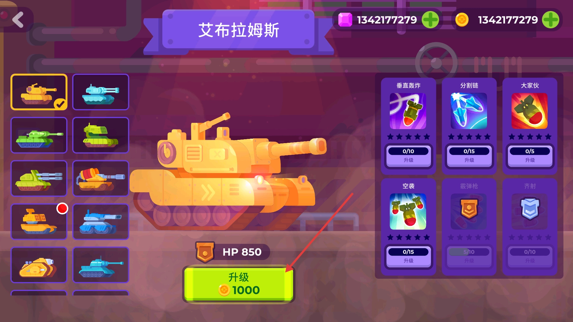 1、在坦克选择界面,点击【艾布拉姆斯】的【升级】按钮,消耗【1000】货币提升坦克属性增强战斗能力。