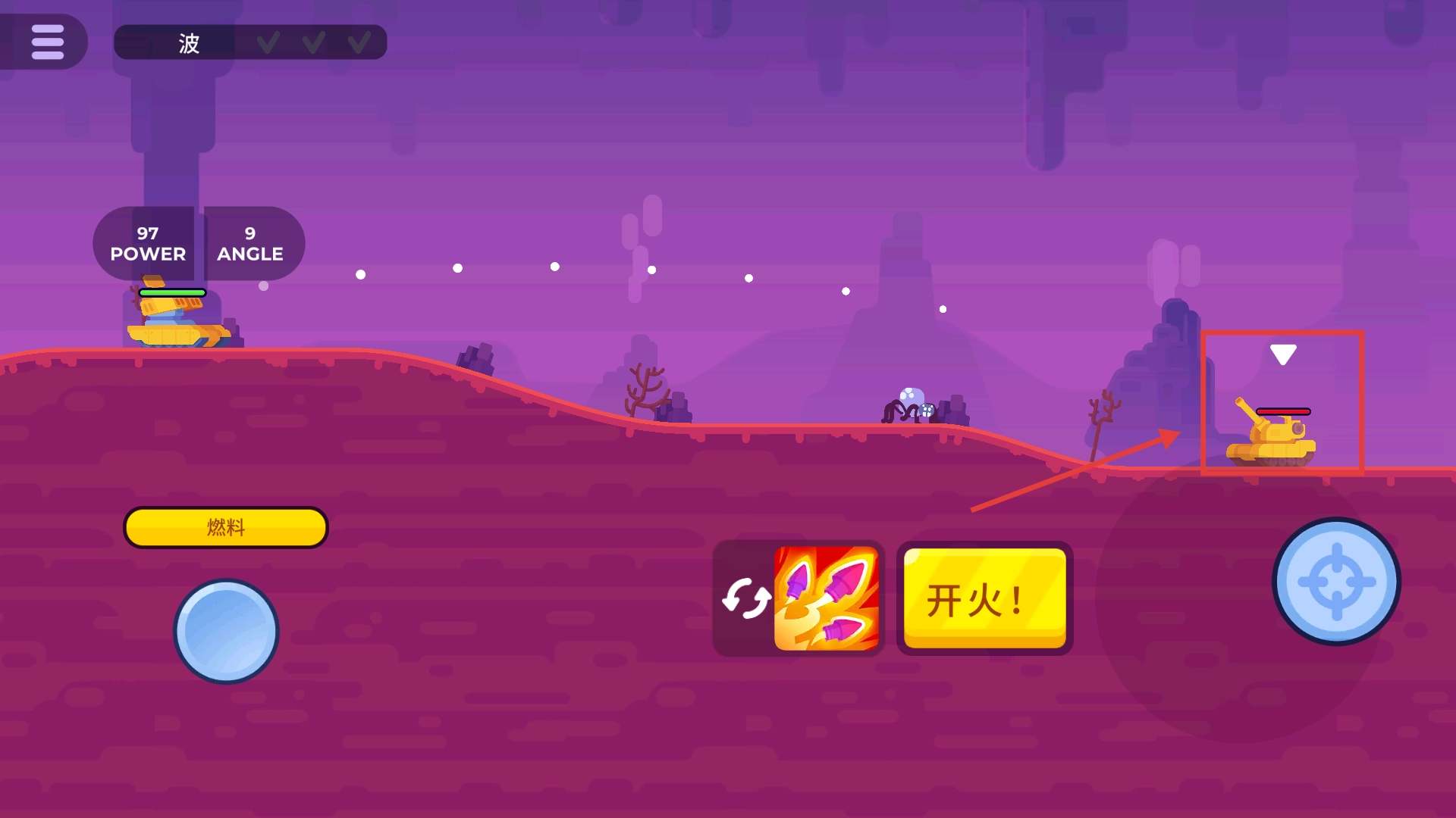 3、在战斗场景中调整角度和力度后,点击【开火!】按钮精准攻击敌方坦克消耗燃料推进战局。