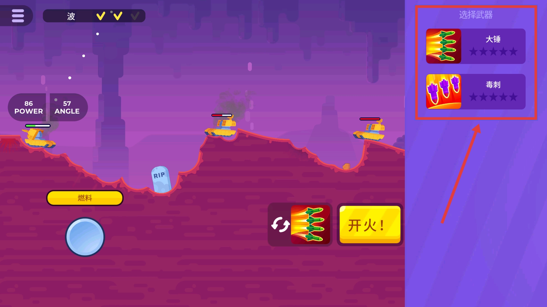 2、发射弹药前,先查看右侧的弹药选项,依据敌方所处位置和地形情况挑选合适的弹药类型,确定好弹道轨迹后,点击开火按钮即可完成攻击。