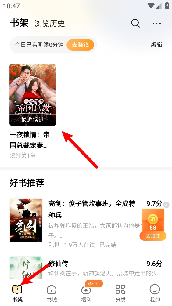3、回到首页后切换到“书架”板块,就能查看已添加的小说资源了。