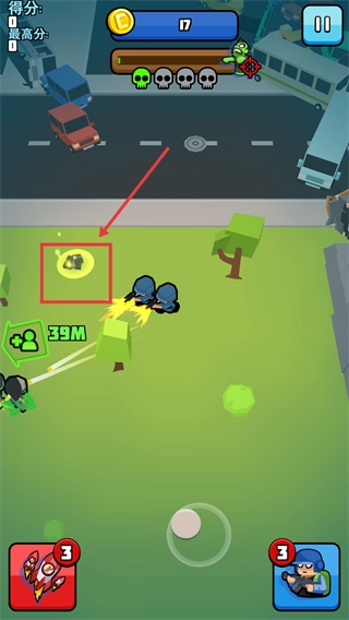 3、遇到幸存者图标时及时靠近获取增援,增加团队人数可提升火力应对更多僵尸威胁。
