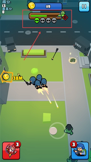 4、持续消灭僵尸推进上方进度条,完成关卡目标可解锁新区域获取更多奖励提升实力。