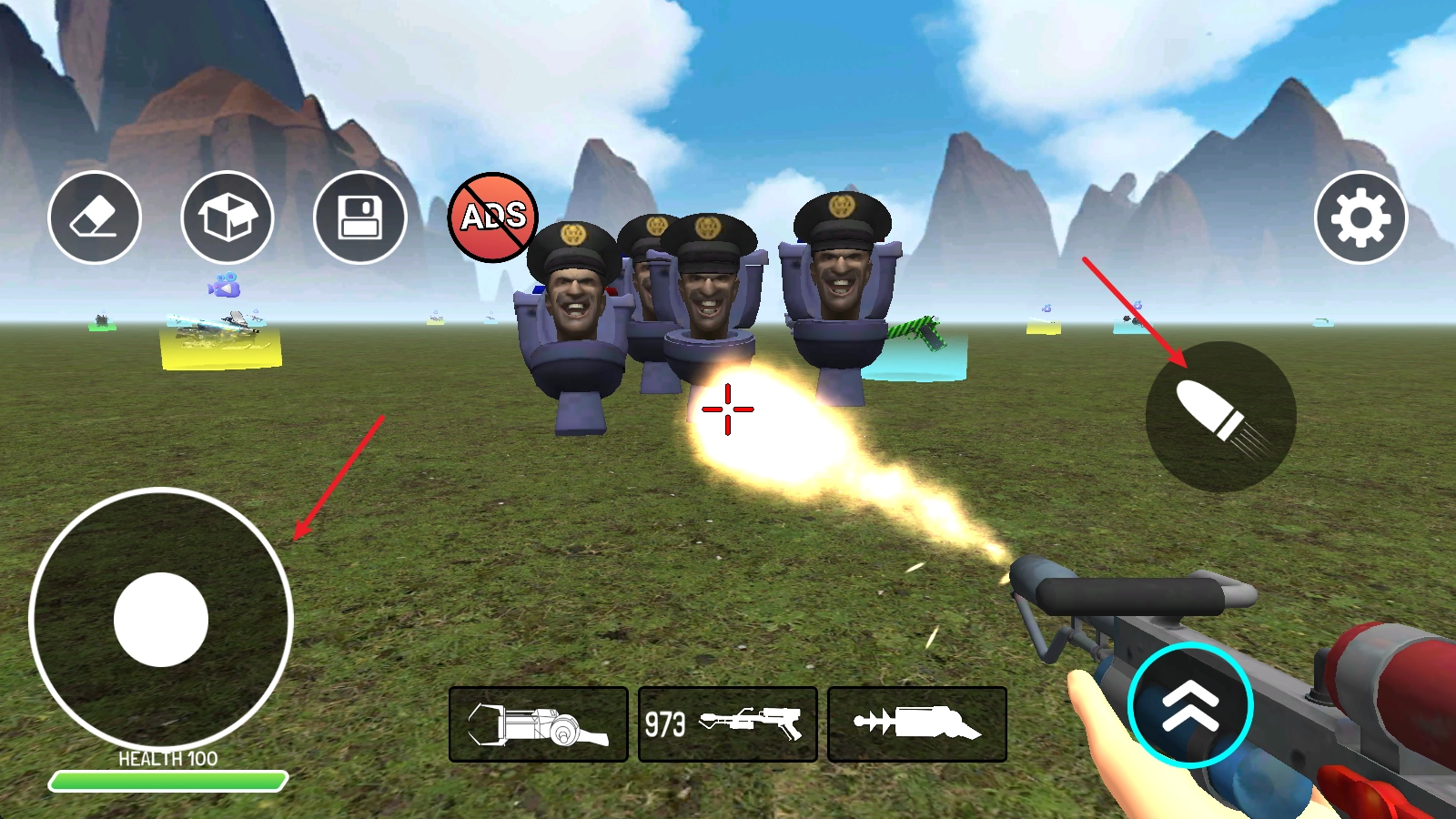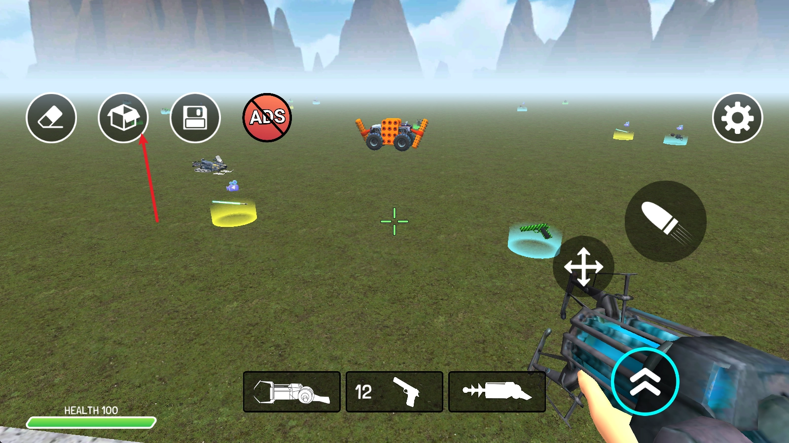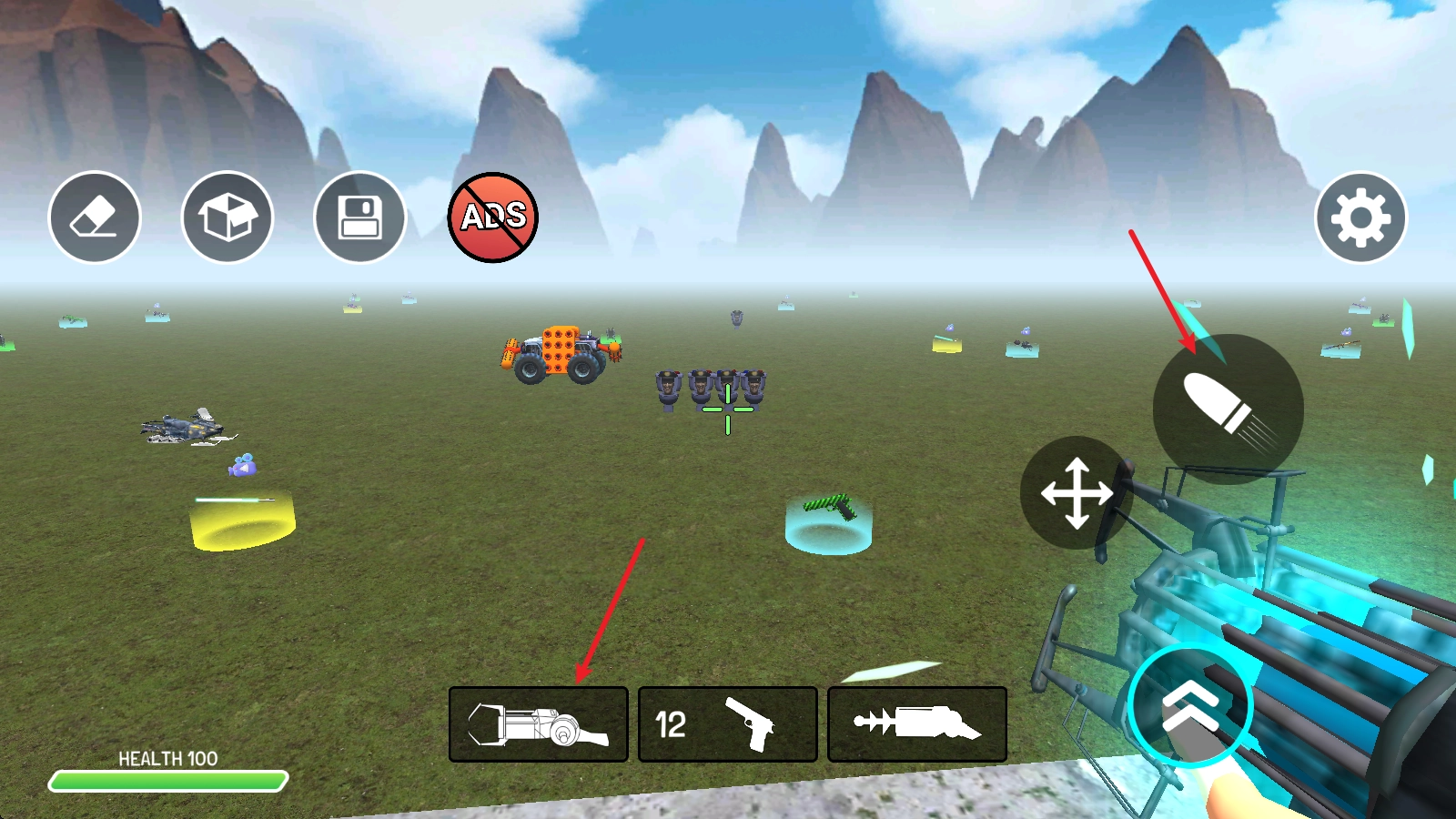 在游戏里,点击左下角的首个武器并发射,即可在场景中添加敌人。