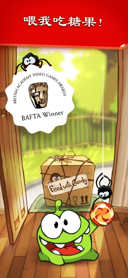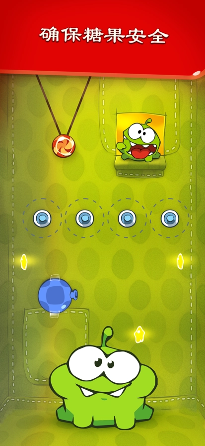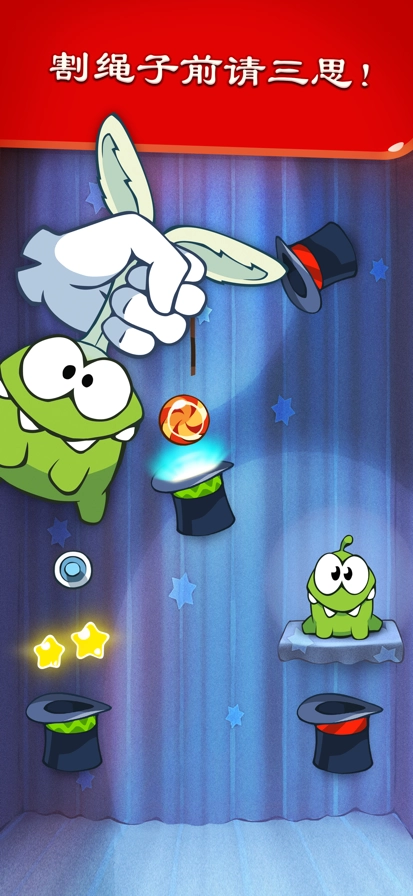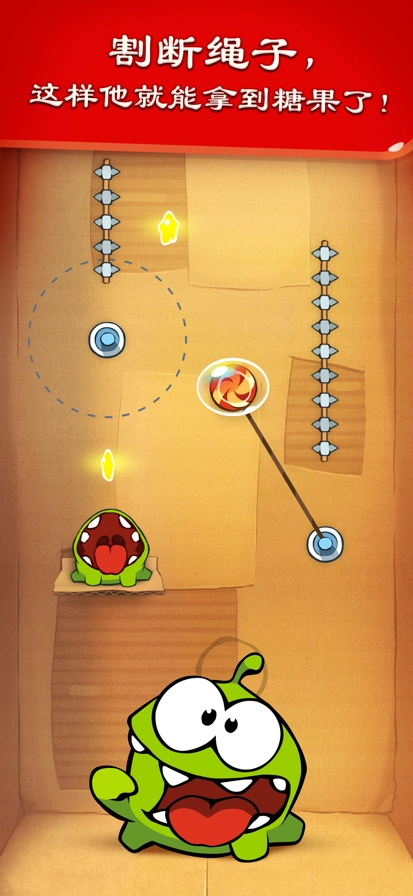 在游戏里,玩家需要剪断绳子,使糖果既能撞破周围的星星,又能顺利落入Om Nom的口中。
