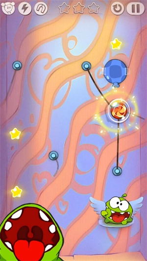 2、游戏的玩法很新颖,你要用手指切断绳子,让糖果掉进小怪兽的嘴里,关键是还得让糖果在掉落的过程中吃到星星。