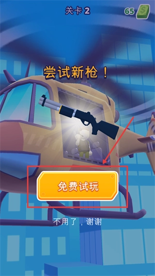 1、关卡2中出现新枪时,点击免费试玩按钮体验新武器,能有效提升战斗中的击杀效率。