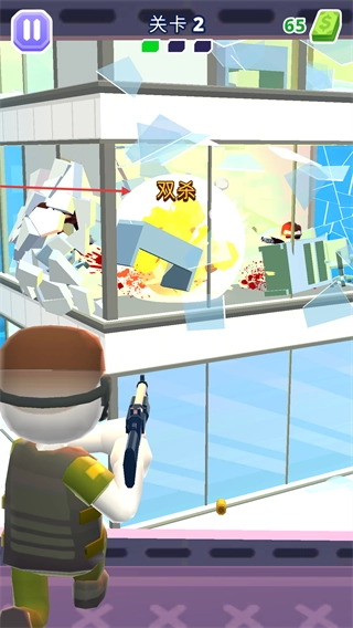 1、3D立体场景与火柴人造型相结合,辅以玻璃破碎和子弹炸裂的特效,为玩家带来沉浸式的射击乐趣和强烈的视觉冲击。