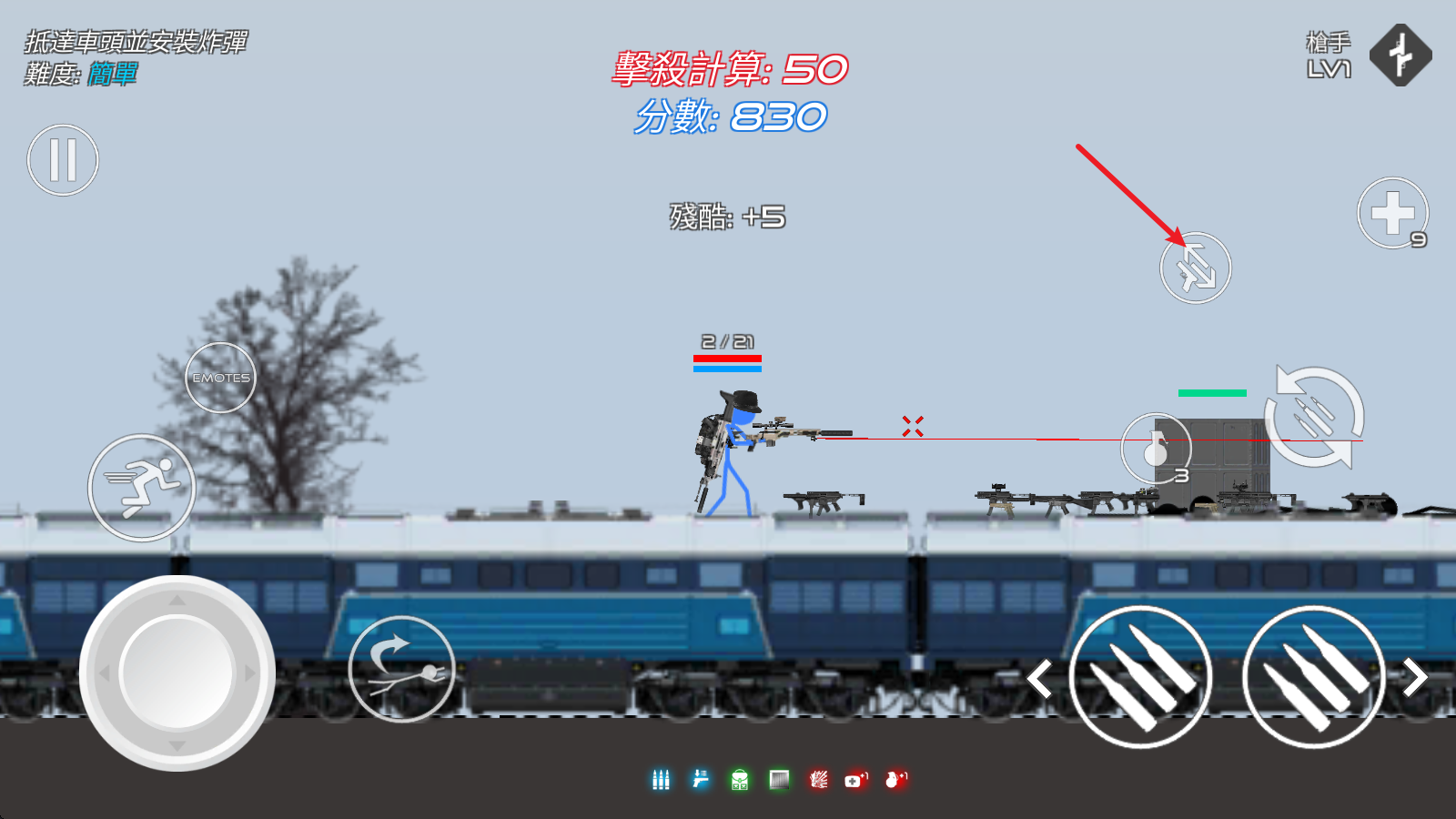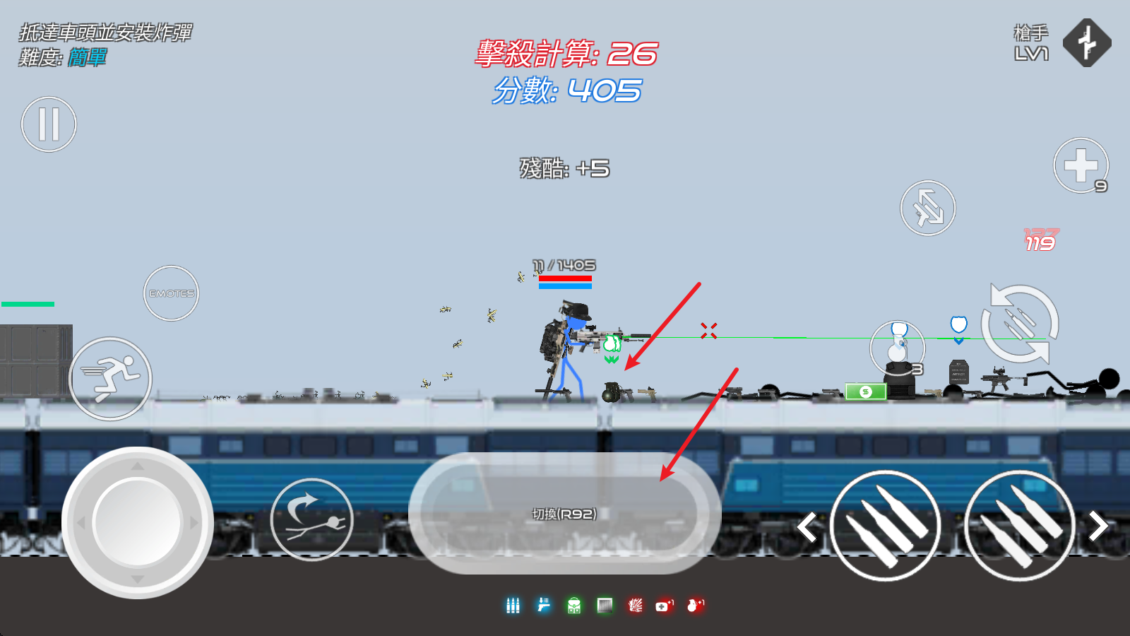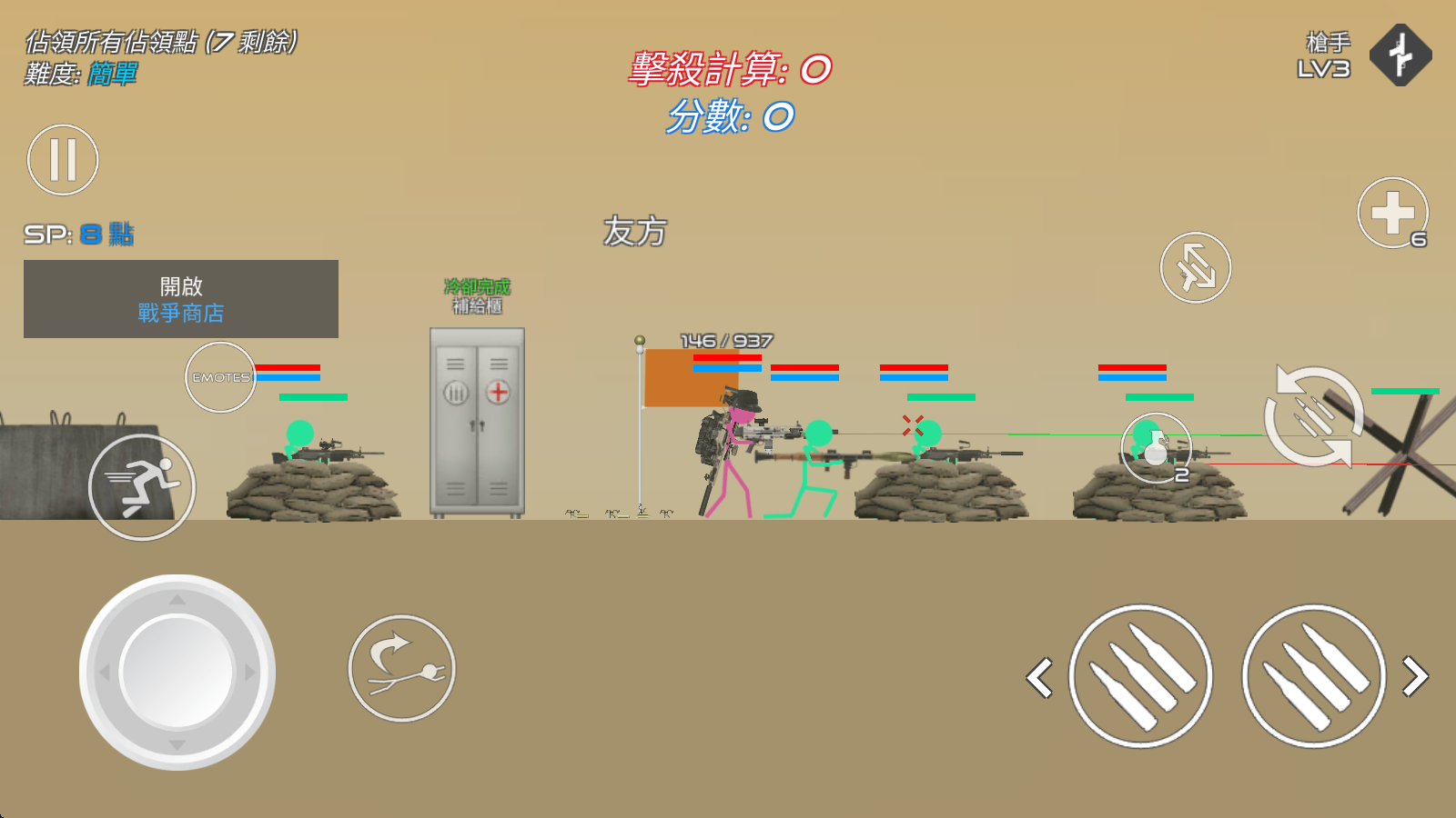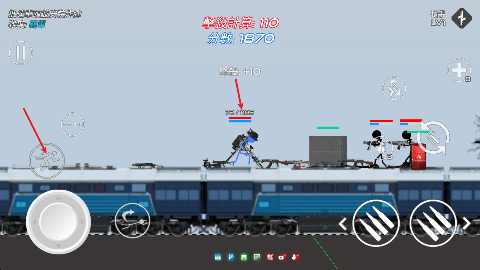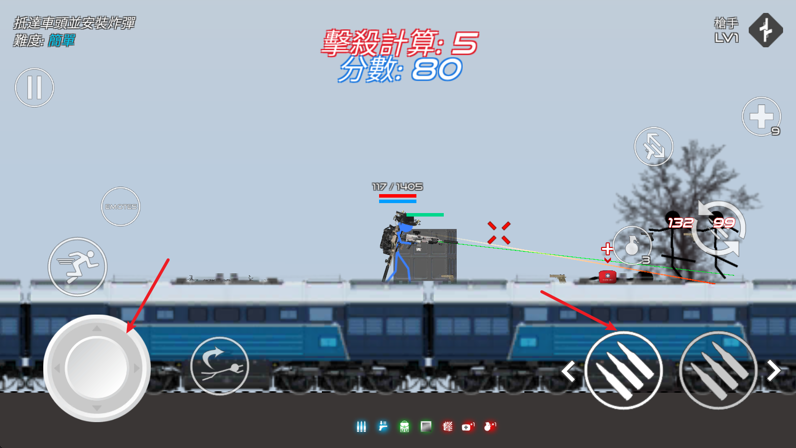 进入战场后,左侧的摇杆可操控角色移动,右侧的子弹按钮用于射击。