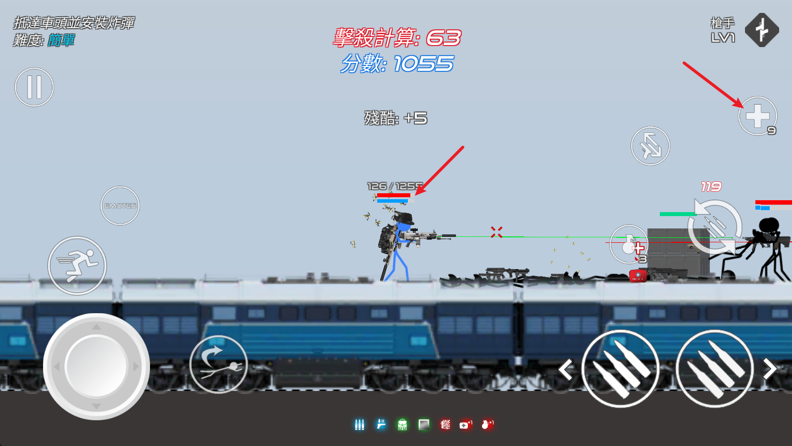 6、角色头顶显示的是血条,当角色生命值下降后,可点击右侧的医疗包进行回血操作。