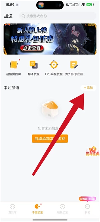 1、启动雷神加速器,在主界面“本地加速”板块的右侧找到并点击“添加”按钮,随后进入游戏页面。