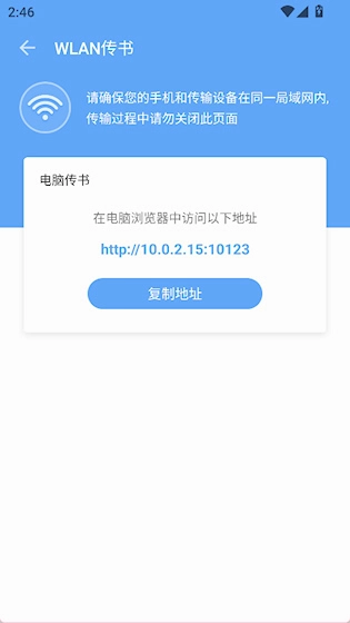 3、手机与电脑连接同一WiFi,在电脑浏览器里输入显示的地址进行传书