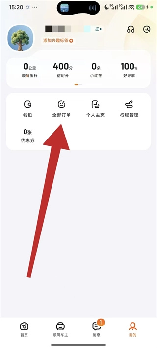 2、在个人中心页面,点击全部订单,进入乘车记录页面。