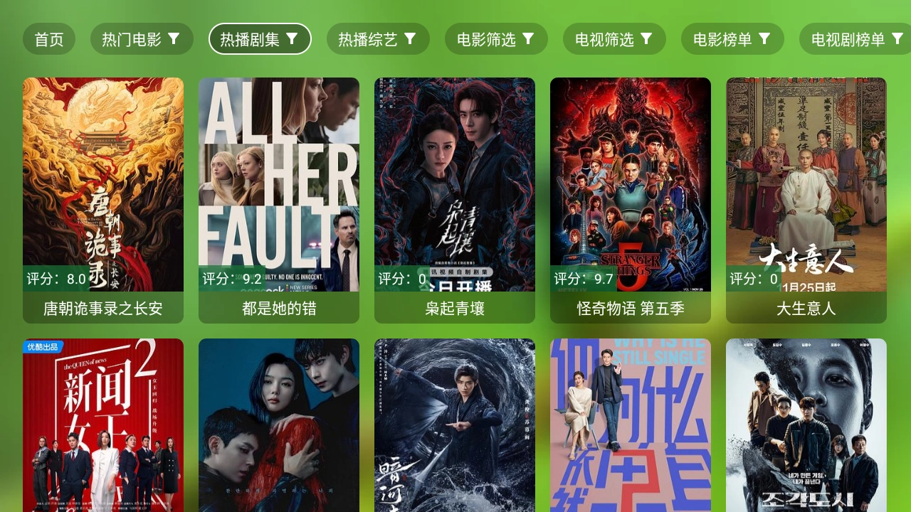 1.启动爆米花影视TV应用,进入首页查看最新的影视推荐内容