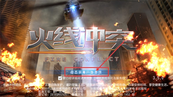 1、进入【火线冲突】-【FIRE-CONFLICT】的启动界面,勾选相关协议后,点击【点击屏幕开始游戏】按钮,就能进入游戏开启战斗流程。