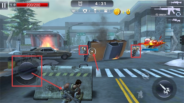 2、战斗界面中,通过左侧【移动按钮】操控角色,借助掩体规避伤害,时刻关注【200/200】-生命状态以维持战斗能力。