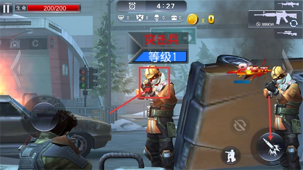 3、遇到【等级1】-【突击兵】时,瞄准目标发起攻击,配合右侧技能按钮强化输出,触发【2连击】可提升战斗效率。