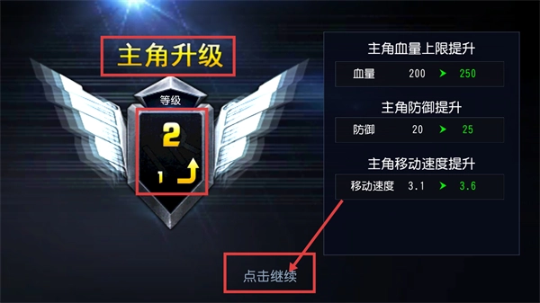 4、达成条件后触发【主角升级】,等级升至【2】,血量-防御-移动速度同步提升,点击【点击继续】返回战斗。