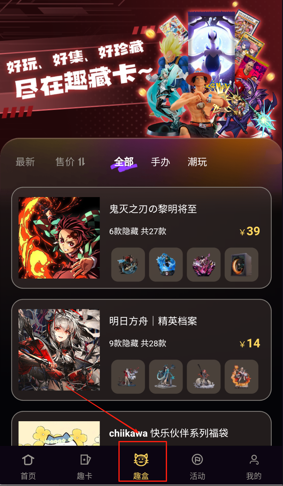 2、进入盲盒专区选择卡牌类型,每日免费参与基础抽卡。