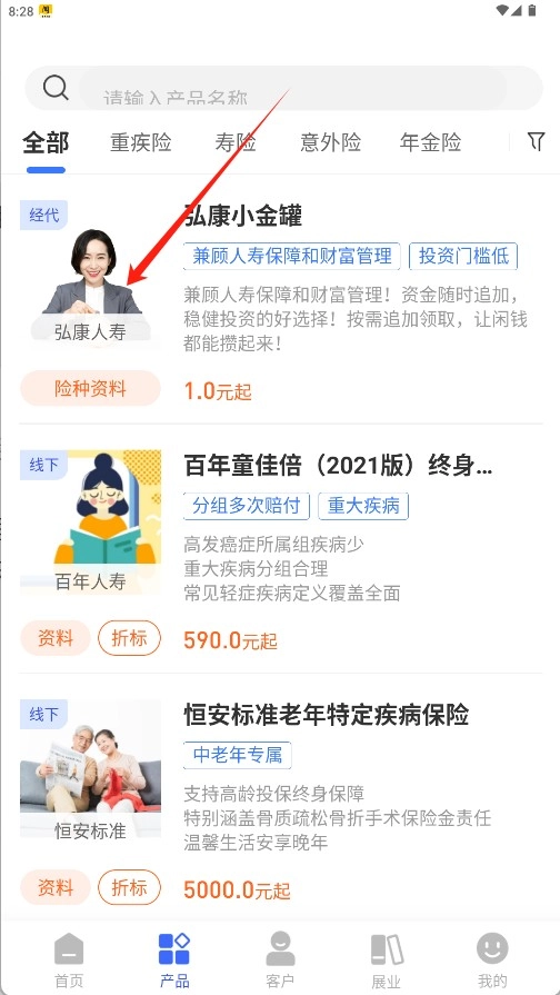 3、在产品页面浏览或搜索目标保险产品,点击“险种资料”按钮查看产品详细信息。