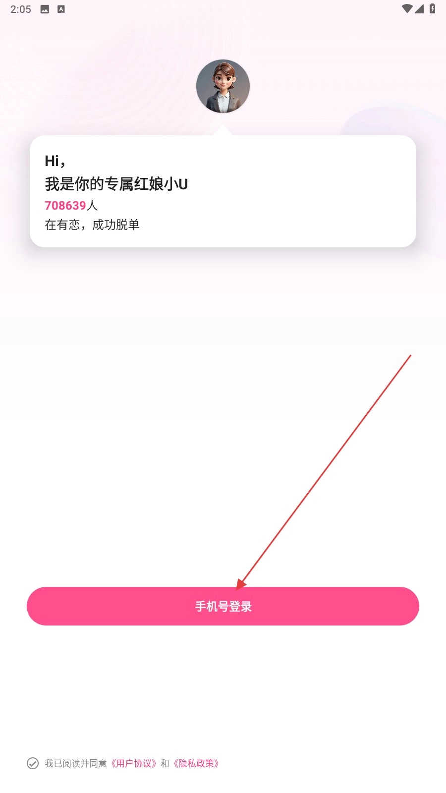 2、在专属红娘小U界面,点击【手机号登录】进入登录流程。
