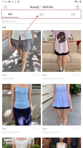 1、点击页面上方【服装】分类标签,进入服装商品展示页面。