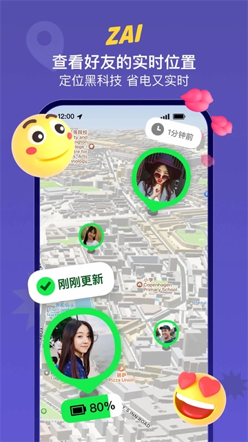 好友和家人之间可以分享彼此的位置;位置信息会在后台持续更新;ZAI的算法能够减少电量消耗。