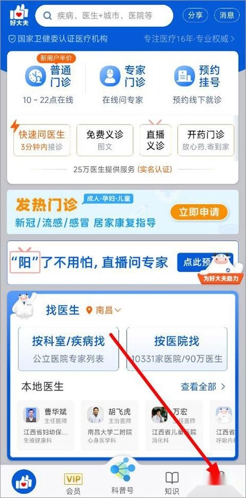 1、打开好大夫在线应用,登录账号后进入主界面,点击页面右下角的“我的”选项;