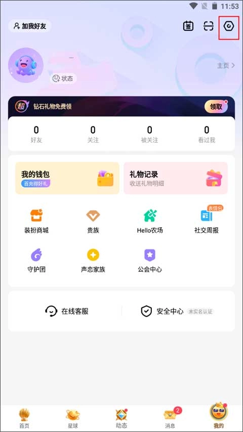 3、在个人信息界面点击右上角的“齿轮”图标打开设置界面。