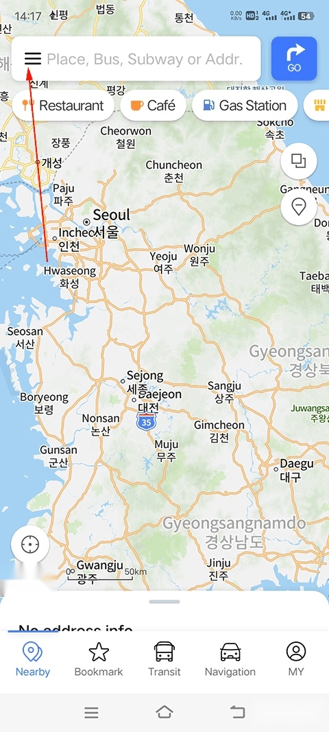 1、第一步先安装安卓版的Naver地图,打开后进入首页,接着点击左上角的三条横线图标。