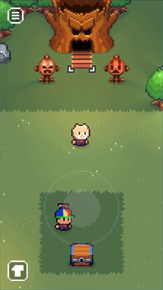 1、在像素探索场景里,操控角色移动到红色框内的【白色圆形】操作区域,顺着楼梯往下探索,从而开启洞穴探索的流程。