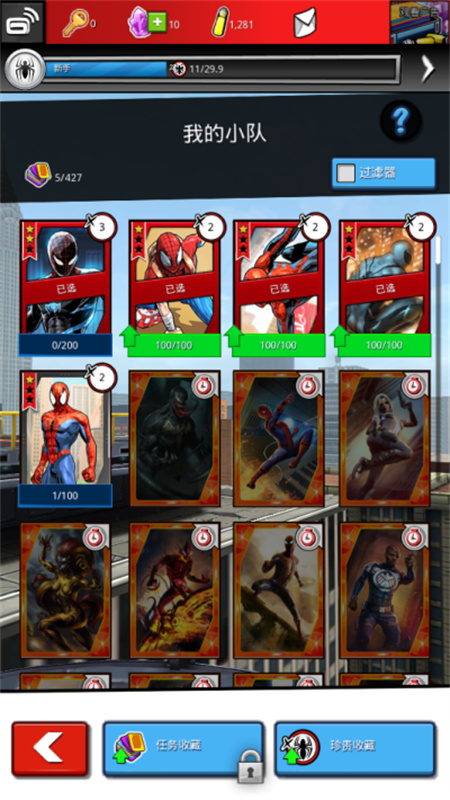 3、收集、合并并升级蜘蛛侠,每位蜘蛛侠都具备独特优势,你也能派遣他们前往曼哈顿执行“蜘蛛侠行动”任务。
