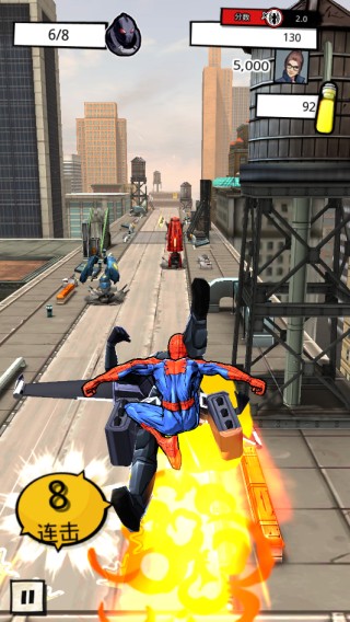 4、尽情体验首款蜘蛛侠跑酷游戏的刺激感!在混乱的曼哈顿飞荡穿梭、奔跑跳跃、格斗对战,感受7种各具特色的漫威场景!