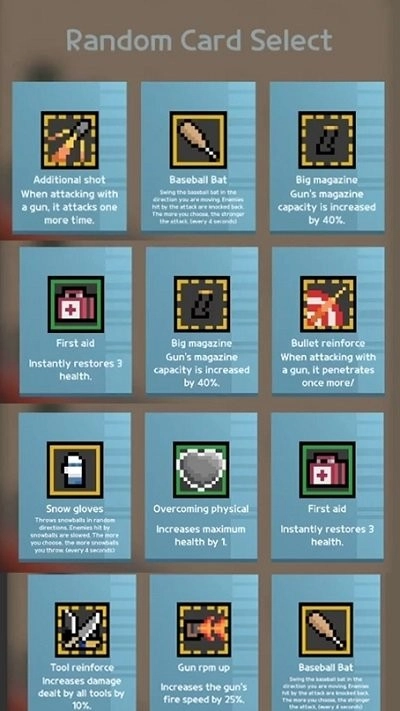 4、击败丧尸会掉落金币与其他道具,拾取这些奖励后,能够提升角色等级,还可以自主选择作战武器以及其他增益效果(buff)。