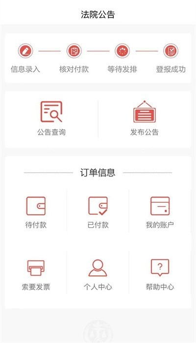 1、首页:进入后,首页会展示最新的法律公告与法院通知。