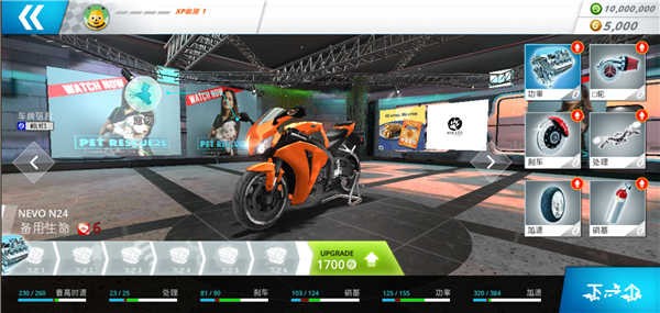 3、在这里能够更换摩托车的各类配件,像车轮、引擎、刹车之类的都可以进行更换。