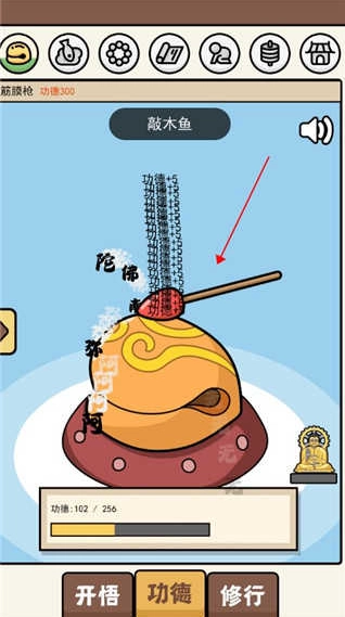 点击屏幕任意位置就能完成木鱼敲击,开启修行之旅。刚开始时,玩家的功德值只有10点,而且会自然减少,得不断操作才能让数值保持稳定。