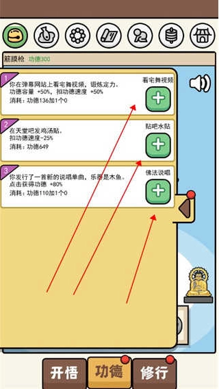 每款道具都有其独特的功能属性,能针对性地帮助玩家提高功德积累的效率,再配上拟真的音效设计,进一步增强玩法上的交互反馈。