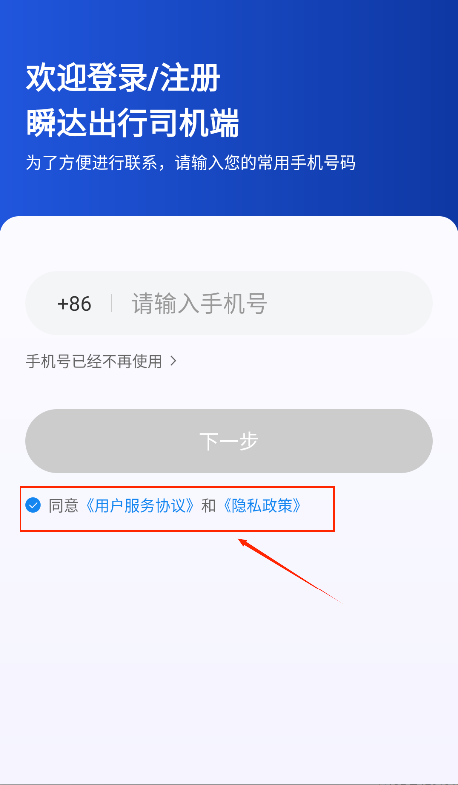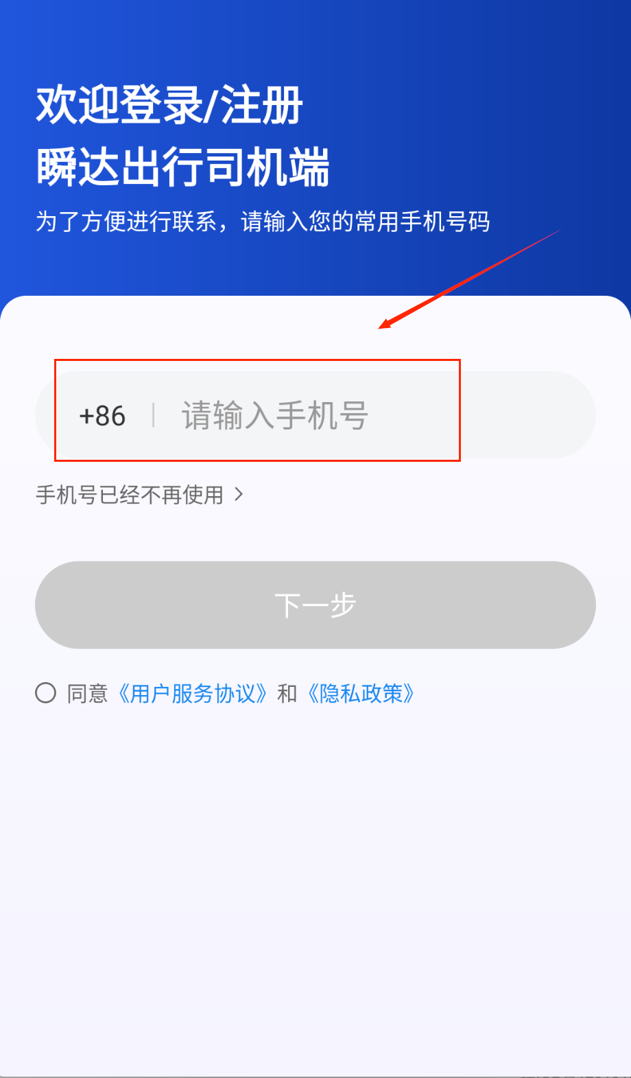 使用软件的第一步是注册登录哦。打开瞬达出行司机端,在登录注册页面填写你平时用的手机号码,注意要按照带+86的格式来输入。