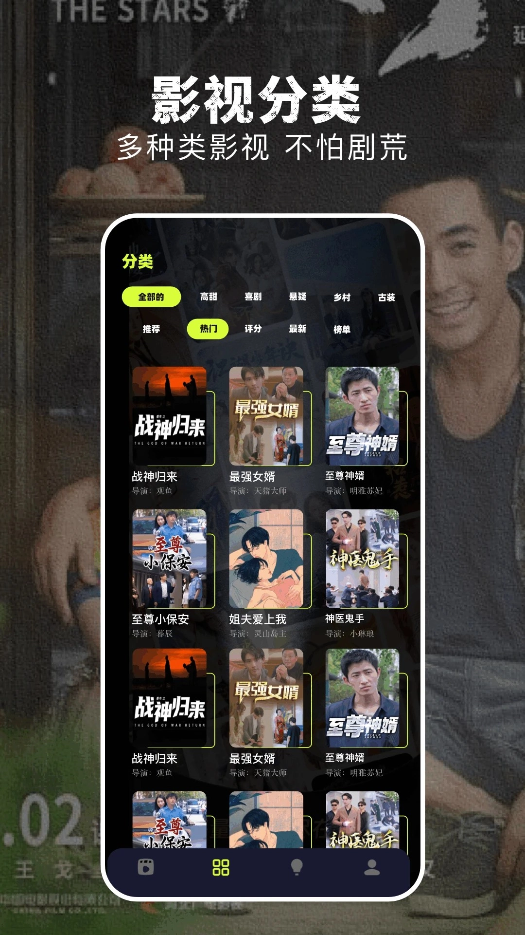 操作逻辑:界面设计简洁明了,设有“首页”“分类”“搜索”“个人中心”四大功能模块,可支持关键词、演员、导演等多维度的搜索方式。