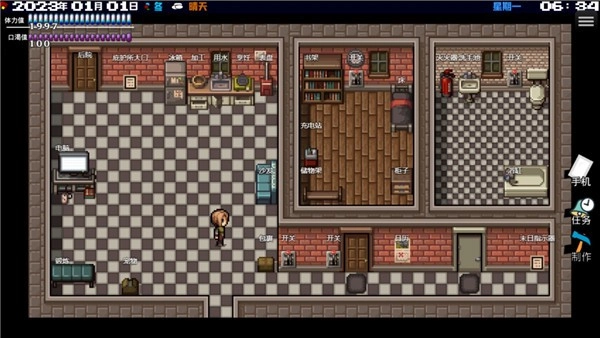 刚开始阶段,水资源是最关键的。由于尚未进入末世,普通水龙头仍能正常供水,暂时不会缺水。不过,直饮水既不能直接使用也不能饮用,直接接取的水需要经过净化处理才能使用,但即便净化后也不能直接喝——饮用的话必须把水烧开,烧开水大约需要两分钟,得到热水后,放置一会儿或者在游戏里度过30分钟,就会变成凉白开。烧热水是前期获取饮用水非常便捷且成本低廉的方式,所以需要持续烧开水。除此之外,也可以从商店购买矿泉水,每瓶1金币。在水电供应正常的情况下,这些资源可以直接使用,但使用到一定额度后需要缴费,缴费点在厨房最里面的表头处。