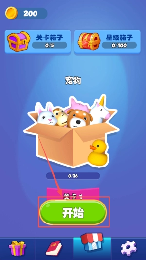 1、进入游戏:点击主界面的“开始”按钮,即可查看关卡箱子的解锁情况以及宠物的收集进度。