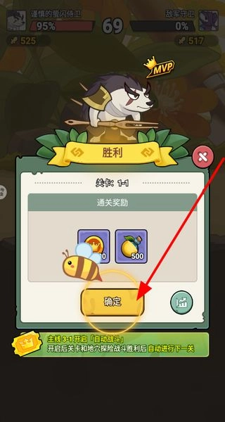 战斗胜利后,查看通关奖励并点击确定按钮领取,这样就能解锁后续的游戏内容。