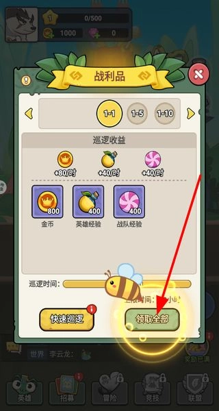 3、在挂机巡逻战利品界面中点击“领取全部”按钮,即可获取离线巡逻收益对应的资源奖励,从而积累游戏内的各类物资。