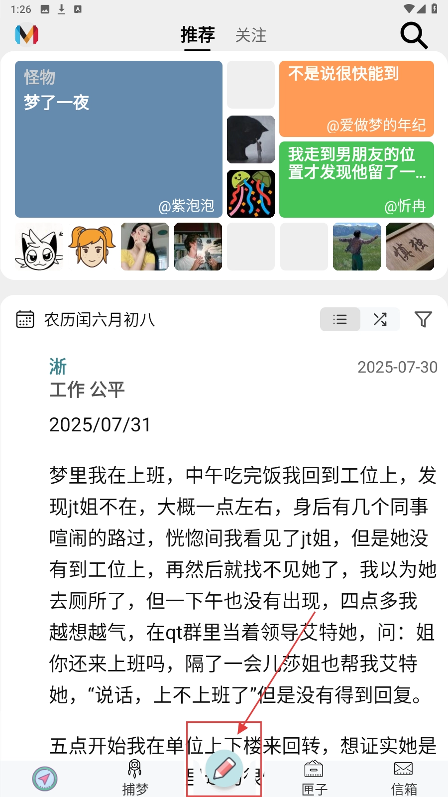 是一款专注于梦境记录与管理的实用类软件,支持用户以公开或私密方式保存梦境内容。公开梦境可让所有用户浏览,私密梦境能加密保护以防窥视。用户可浏览他人公开梦境,参与打卡或观看广告获取积分,积分能兑换解梦券或捕梦道具,满足记录与探索梦境的多样需求,操作简单易上手。1、在首页点击底部的铅笔图标,就能进入新梦记录页面,着手记录梦境内容。