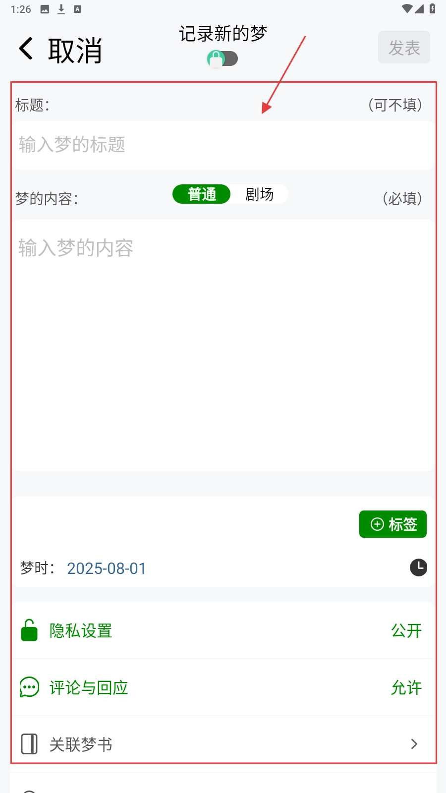 2、在记录页,填标题(选填)、梦的内容(必填),设置标签、梦时等信息。