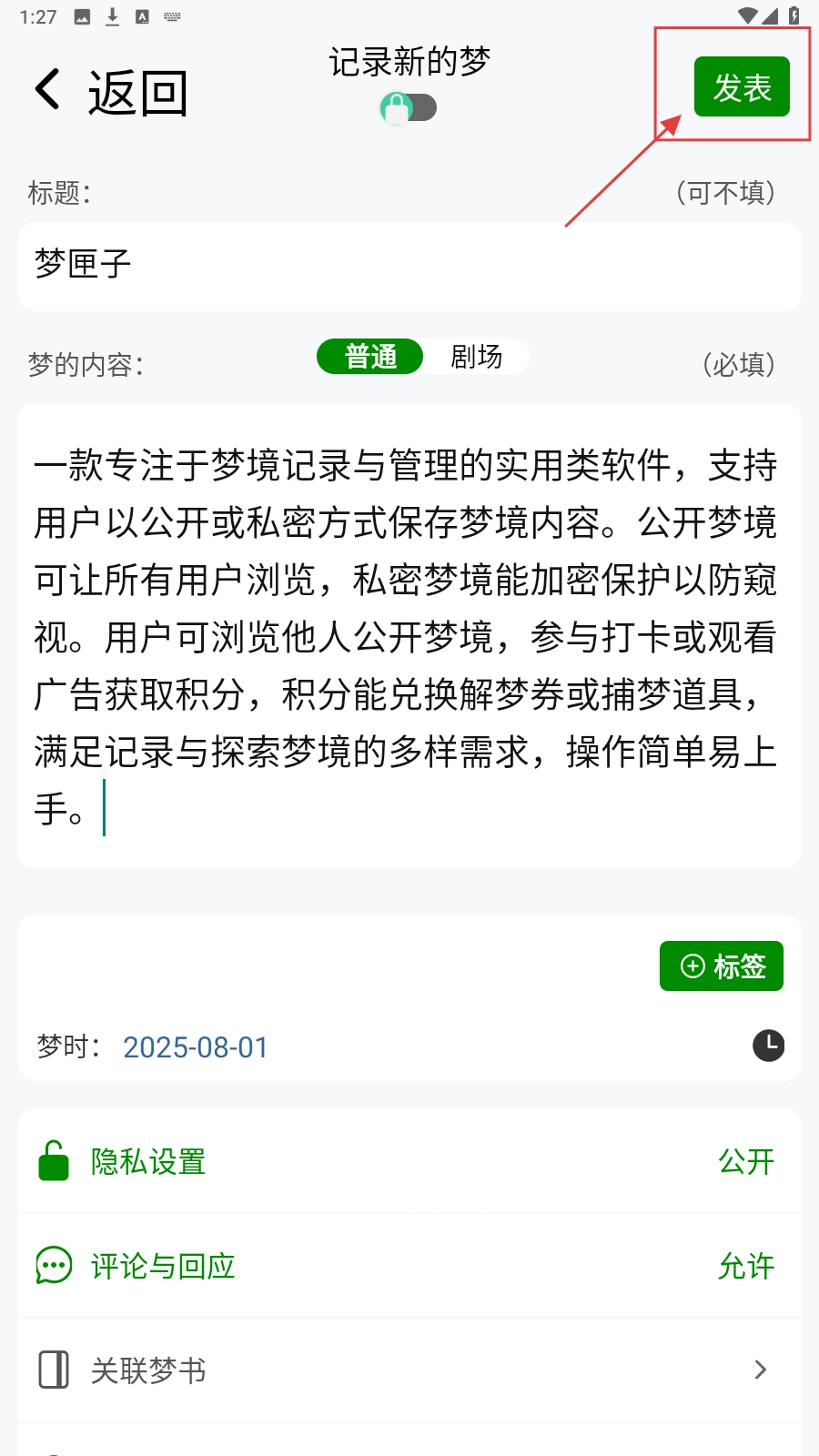 3、填好内容后,点右上角【发表】,发布记录的梦境内容。
